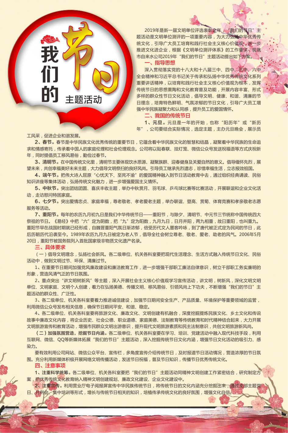 2019年是新一屆文明單位評選表彰之年,“我們的節(jié)日”主題活動是文明單位測評的一項重要內(nèi)容,為大力弘揚中華優(yōu)秀傳統(tǒng)文化,引導(dǎo)廣大員工培育和踐行社會主義核心價值觀,進(jìn)一步推進(jìn)文化進(jìn)企業(yè),根據(jù)《文明單位測評體系》的工作要求,現(xiàn)就市自來水公司2019年“我們的節(jié)日”主題活動提出如下方案。